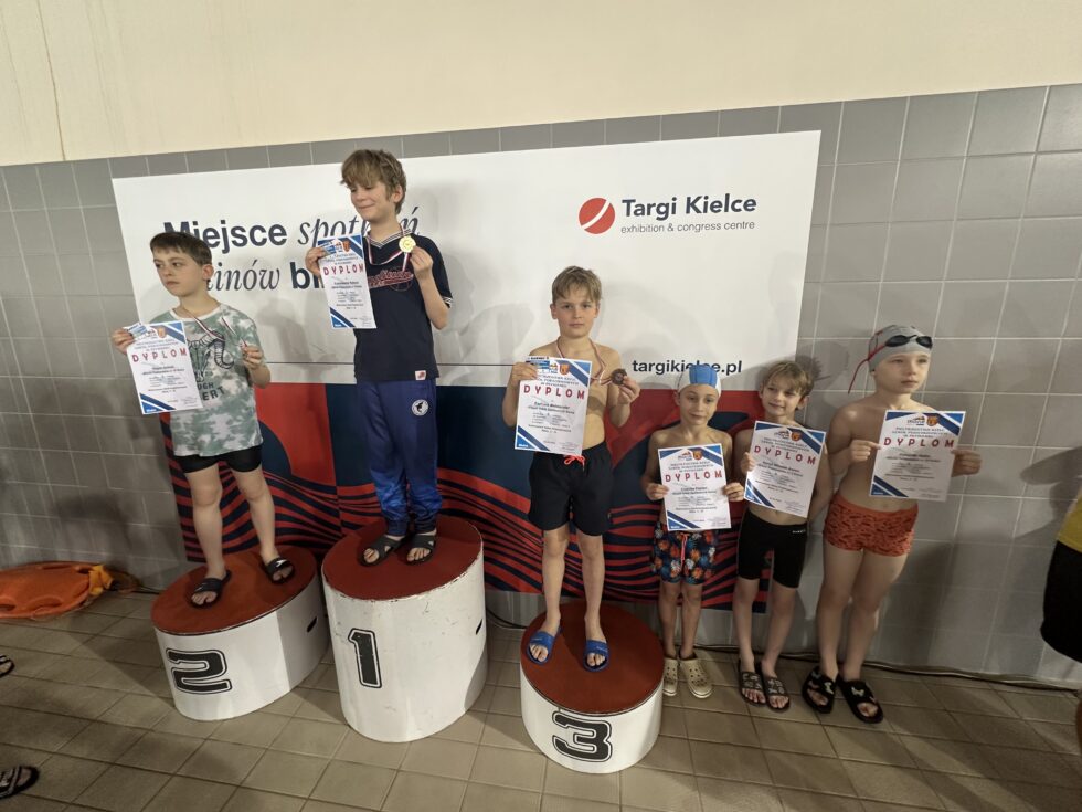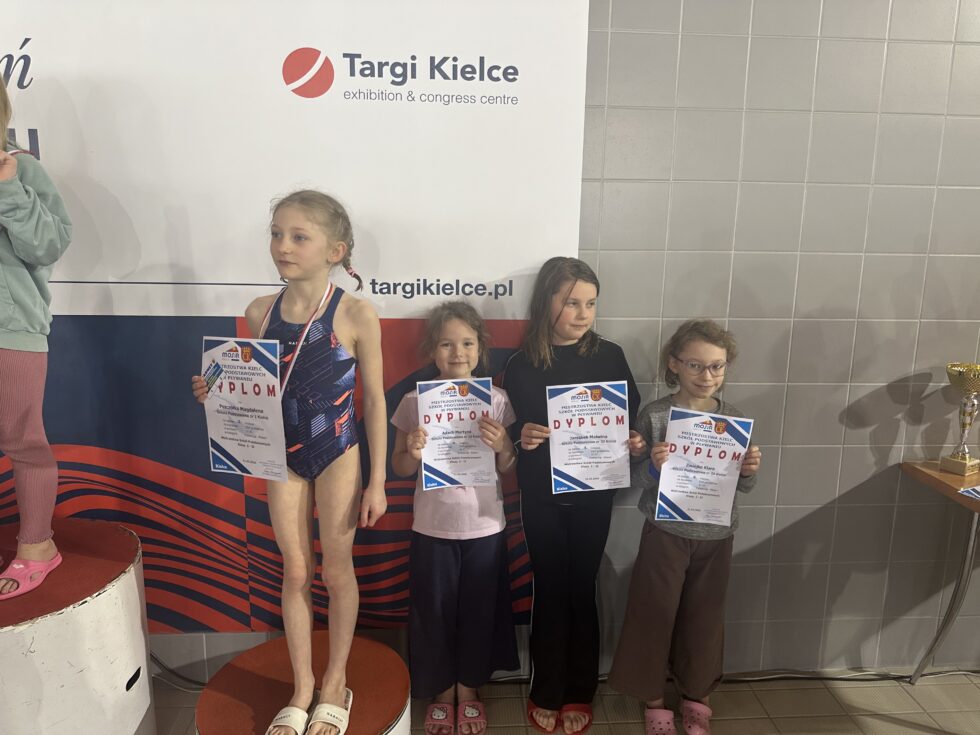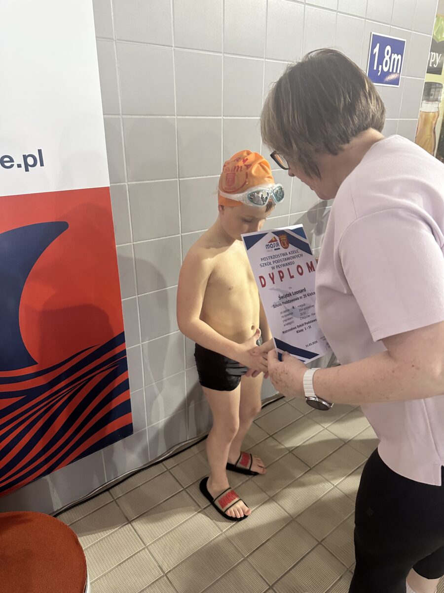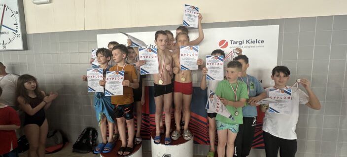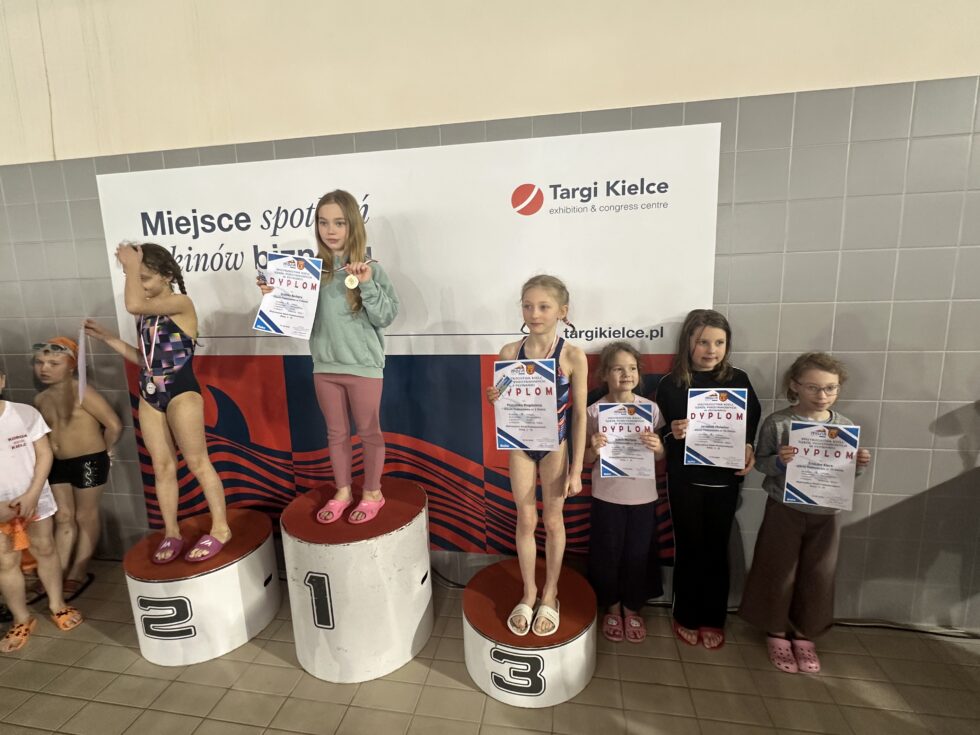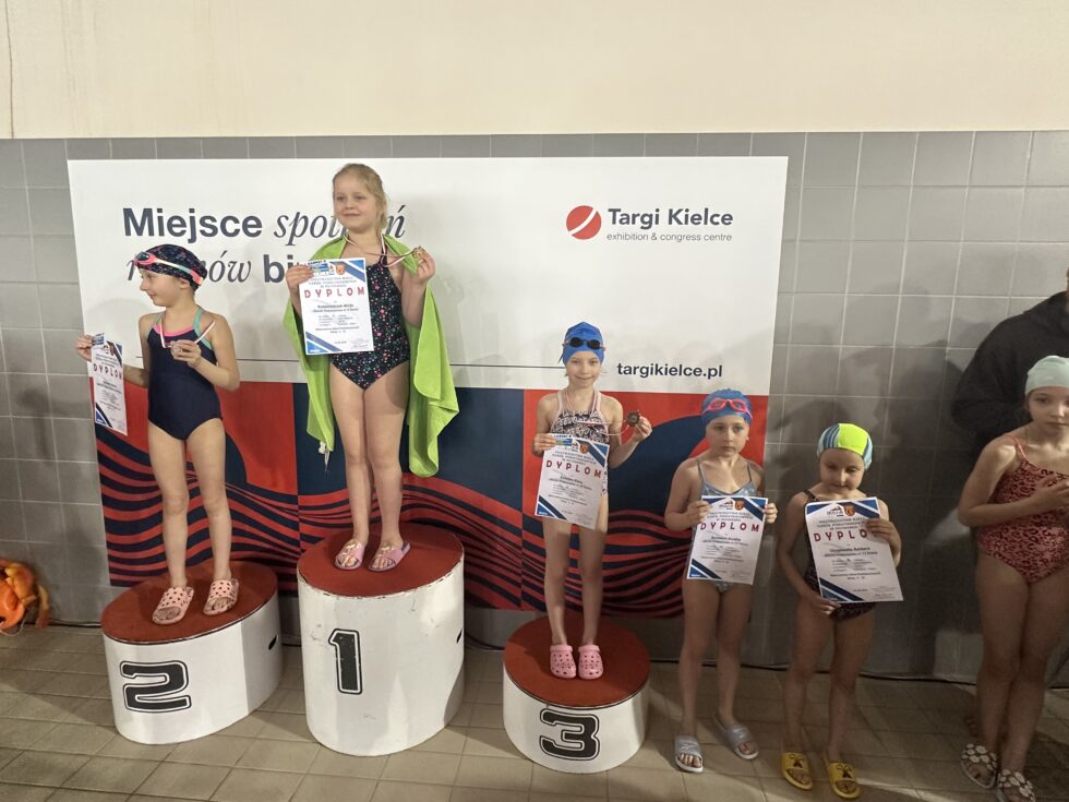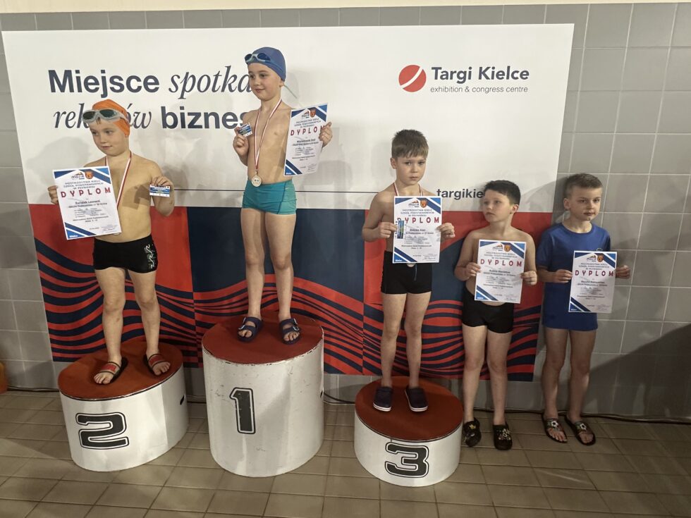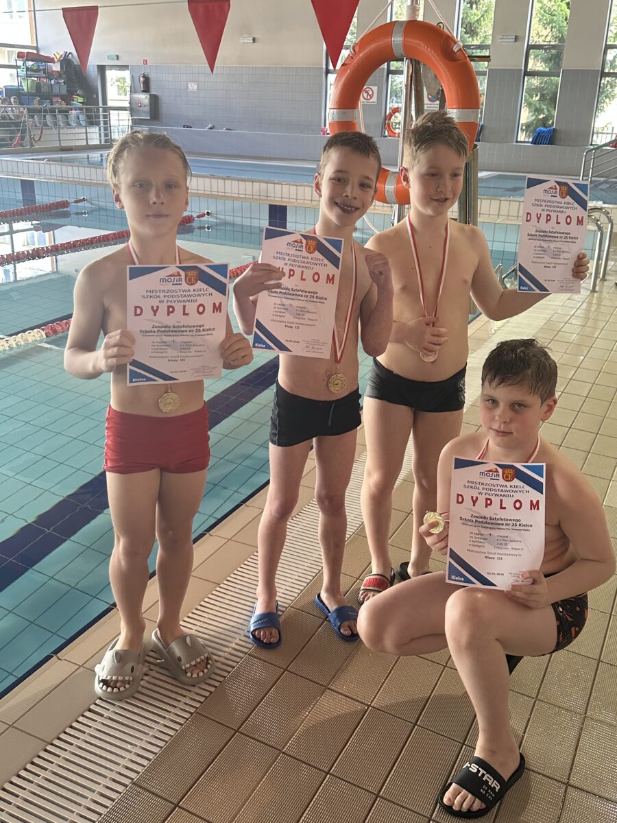 Zawodami klas najmłodszych (I-II) w dniu dzisiejszym -31 marca, zakończyliśmy szereg spotkań na pływalni FOKA w ramach Mistrzostw Kielc Szkół Podstawowych w pływaniu. O ogromnych sukcesach klas VII – VIII informowaliśmy już wcześniej, tu skupimy się na występach pływaków klas I- VI. Uczniowie klas V-VI rywalizowali 18 marca, a na podium stanęli: A. Adamik – III miejsce na dystansie 50m stylem klasycznym wśród chłopców klas V oraz Z. Dybiec – II miejsce na dystansie 50m stylem klasycznym wśród dziewcząt klas V. Następnie do rywalizacji stanęli uczniowie klas III – 23 marca, a tam nasza męska sztafeta (M. Pawłowski, I. Świątek, F. Kwiecień, I. Chmielewski) okazała się najlepsza i zdobyła złote medale!. Wśród klas IV (25 marca) najlepszą okazała się A. Kozera, zdobywając V miejsce na dystansie 50m stylem grzbietowym. Ostatnie z cyklu – dzisiejsze zawody (31 marca) to niewątpliwie sukces naszych najmłodszych pływaków, wśród których bardzo dobre zawody zaliczyli: S. Kubicz – II miejsce na dystansie 25m stylem grzbietowym, IV miejsce na dystansie 25m stylem dowolnym, VII miejsce w sztafecie 4x25m stylem dowolnym ; L. Świątek – IV miejsce na dystansie 25m stylem grzbietowym, II miejsce na dystansie 25m stylem dowolnym, VII miejsce w sztafecie 4x25m stylem dowolnym, K. Żmiejko -VI miejsce na dystansie 25m stylem grzbietowym, III miejsce na dystansie 25m stylem klasycznym, I. Ferens – VII miejsce w sztafecie 4x25m stylem dowolnym oraz A. Piekarski – VI miejsce na dystansie 25m stylem klasycznym, VII miejsce w sztafecie 4x25m stylem dowolnym. Wszystkim naszym reprezentantom dziękujemy za trud włożony w rywalizację i gratulujemy sukcesów!