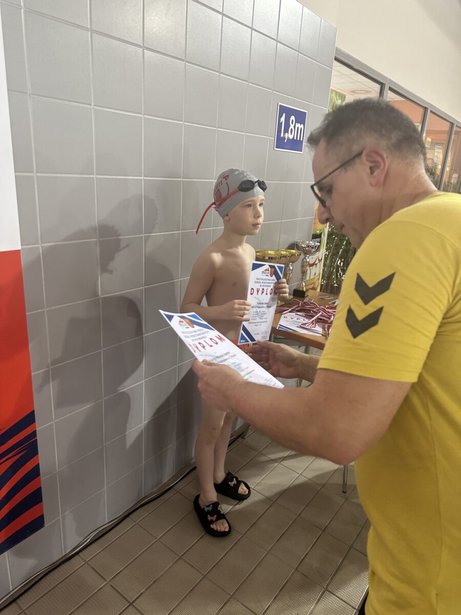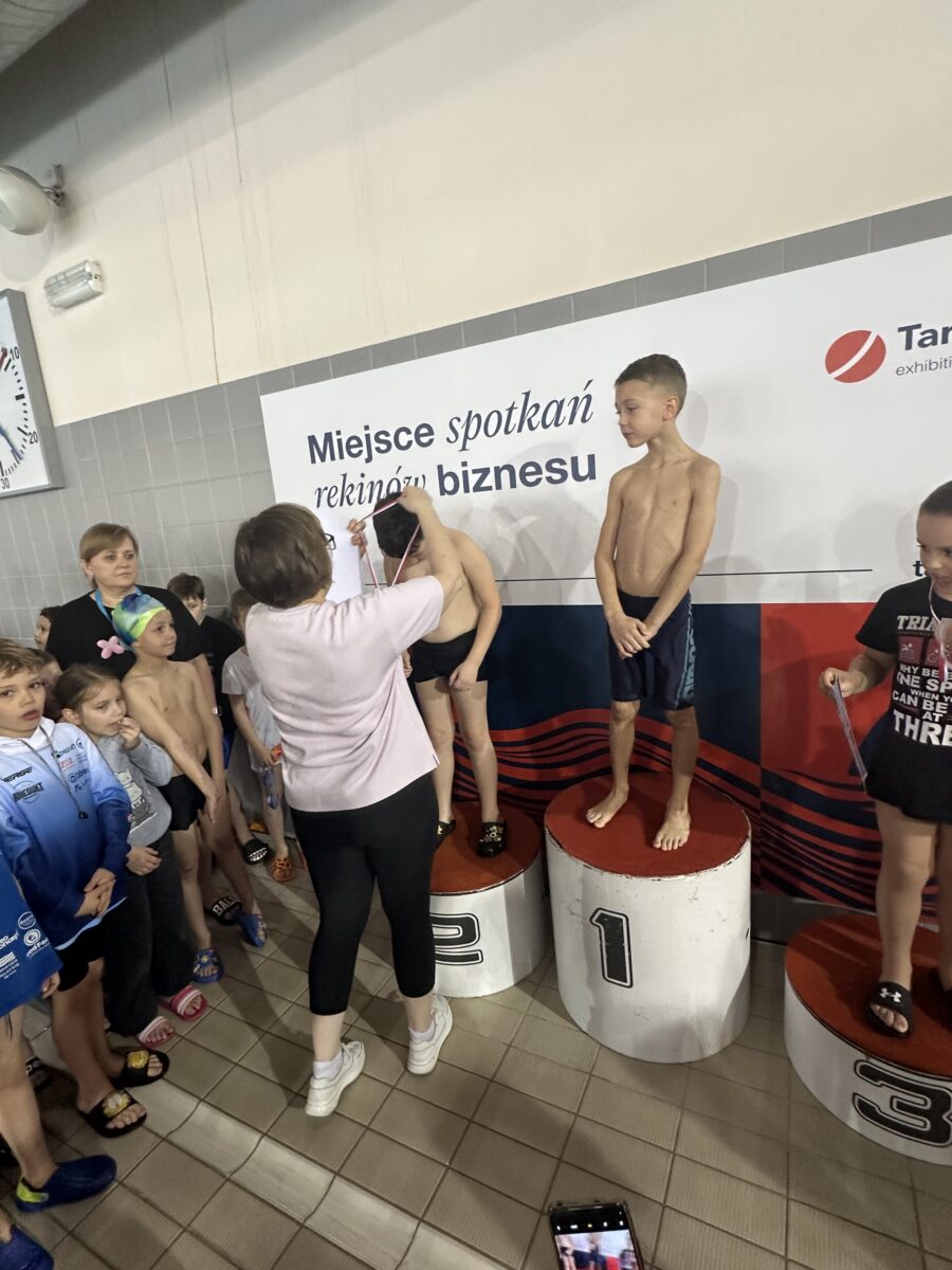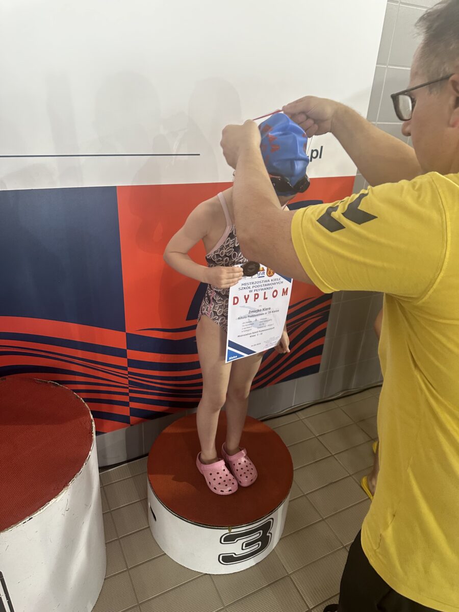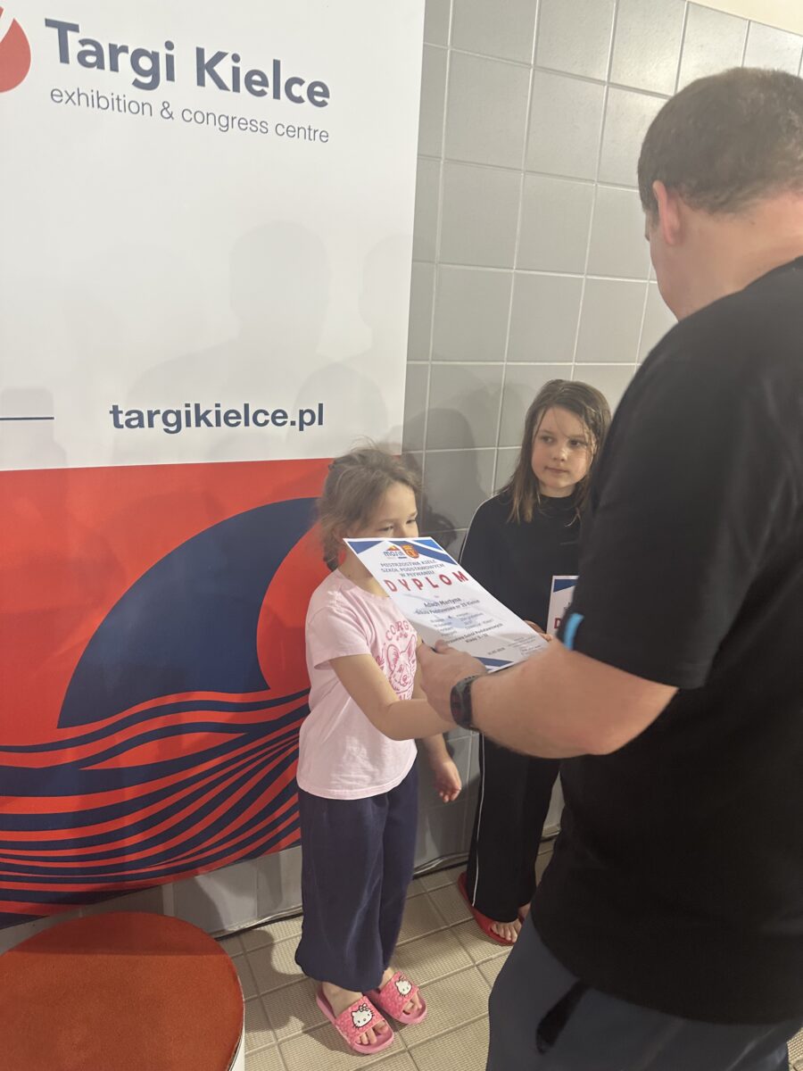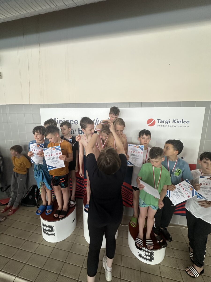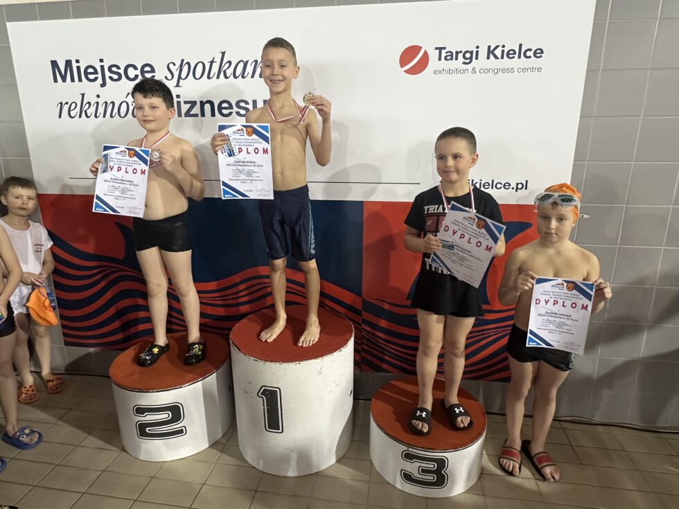 Zawodami klas najmłodszych (I-II) w dniu dzisiejszym -31 marca, zakończyliśmy szereg spotkań na pływalni FOKA w ramach Mistrzostw Kielc Szkół Podstawowych w pływaniu. O ogromnych sukcesach klas VII – VIII informowaliśmy już wcześniej, tu skupimy się na występach pływaków klas I- VI. Uczniowie klas V-VI rywalizowali 18 marca, a na podium stanęli: A. Adamik – III miejsce na dystansie 50m stylem klasycznym wśród chłopców klas V oraz Z. Dybiec – II miejsce na dystansie 50m stylem klasycznym wśród dziewcząt klas V. Następnie do rywalizacji stanęli uczniowie klas III – 23 marca, a tam nasza męska sztafeta (M. Pawłowski, I. Świątek, F. Kwiecień, I. Chmielewski) okazała się najlepsza i zdobyła złote medale!. Wśród klas IV (25 marca) najlepszą okazała się A. Kozera, zdobywając V miejsce na dystansie 50m stylem grzbietowym. Ostatnie z cyklu – dzisiejsze zawody (31 marca) to niewątpliwie sukces naszych najmłodszych pływaków, wśród których bardzo dobre zawody zaliczyli: S. Kubicz – II miejsce na dystansie 25m stylem grzbietowym, IV miejsce na dystansie 25m stylem dowolnym, VII miejsce w sztafecie 4x25m stylem dowolnym ; L. Świątek – IV miejsce na dystansie 25m stylem grzbietowym, II miejsce na dystansie 25m stylem dowolnym, VII miejsce w sztafecie 4x25m stylem dowolnym, K. Żmiejko -VI miejsce na dystansie 25m stylem grzbietowym, III miejsce na dystansie 25m stylem klasycznym, I. Ferens – VII miejsce w sztafecie 4x25m stylem dowolnym oraz A. Piekarski – VI miejsce na dystansie 25m stylem klasycznym, VII miejsce w sztafecie 4x25m stylem dowolnym. Wszystkim naszym reprezentantom dziękujemy za trud włożony w rywalizację i gratulujemy sukcesów!