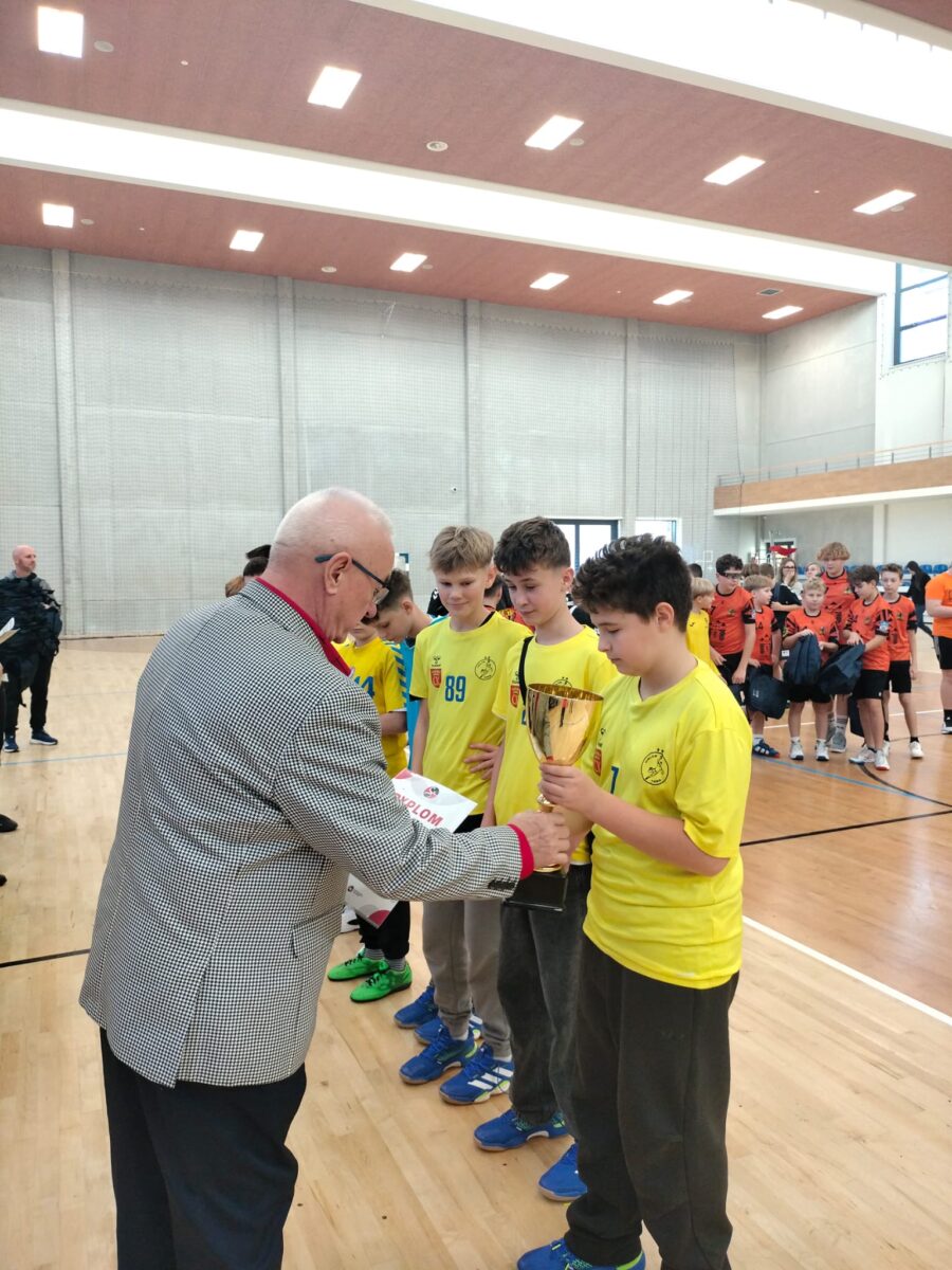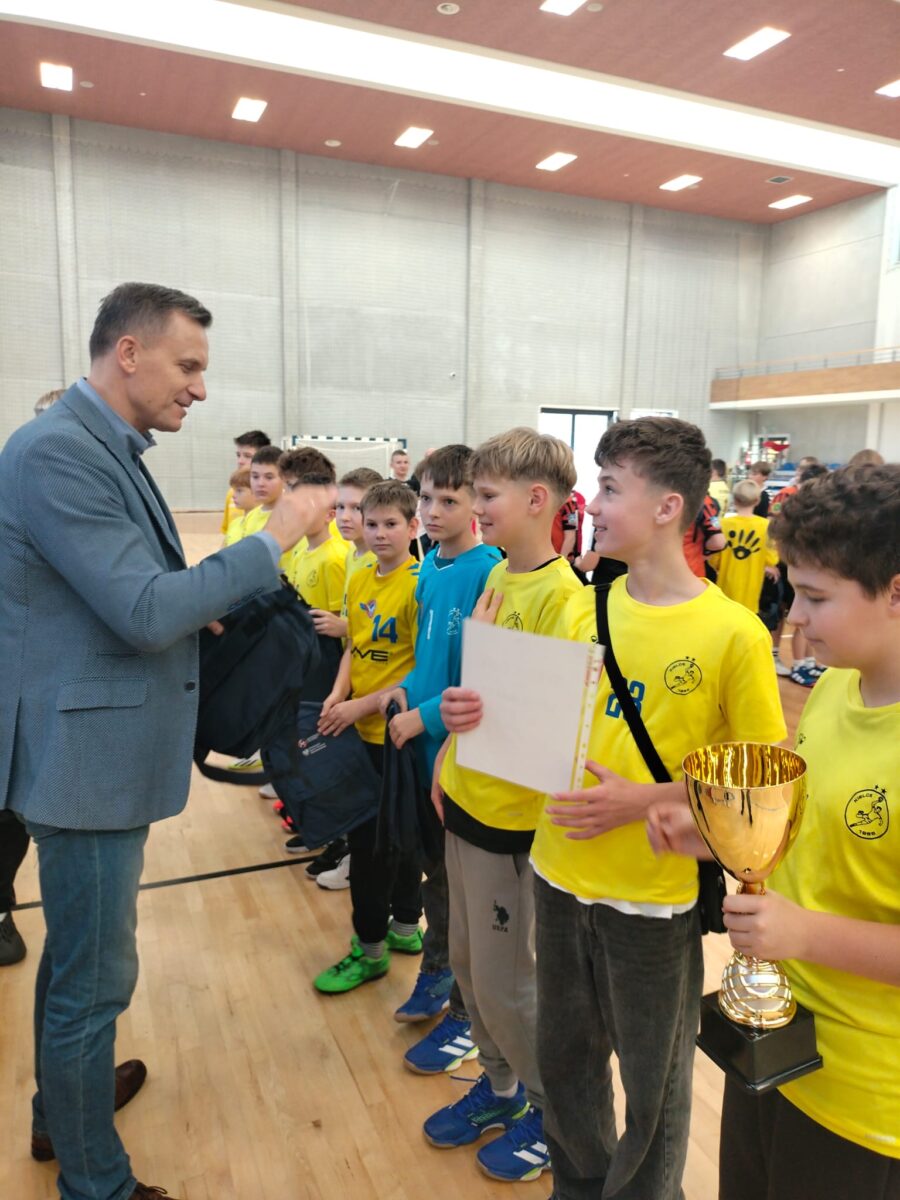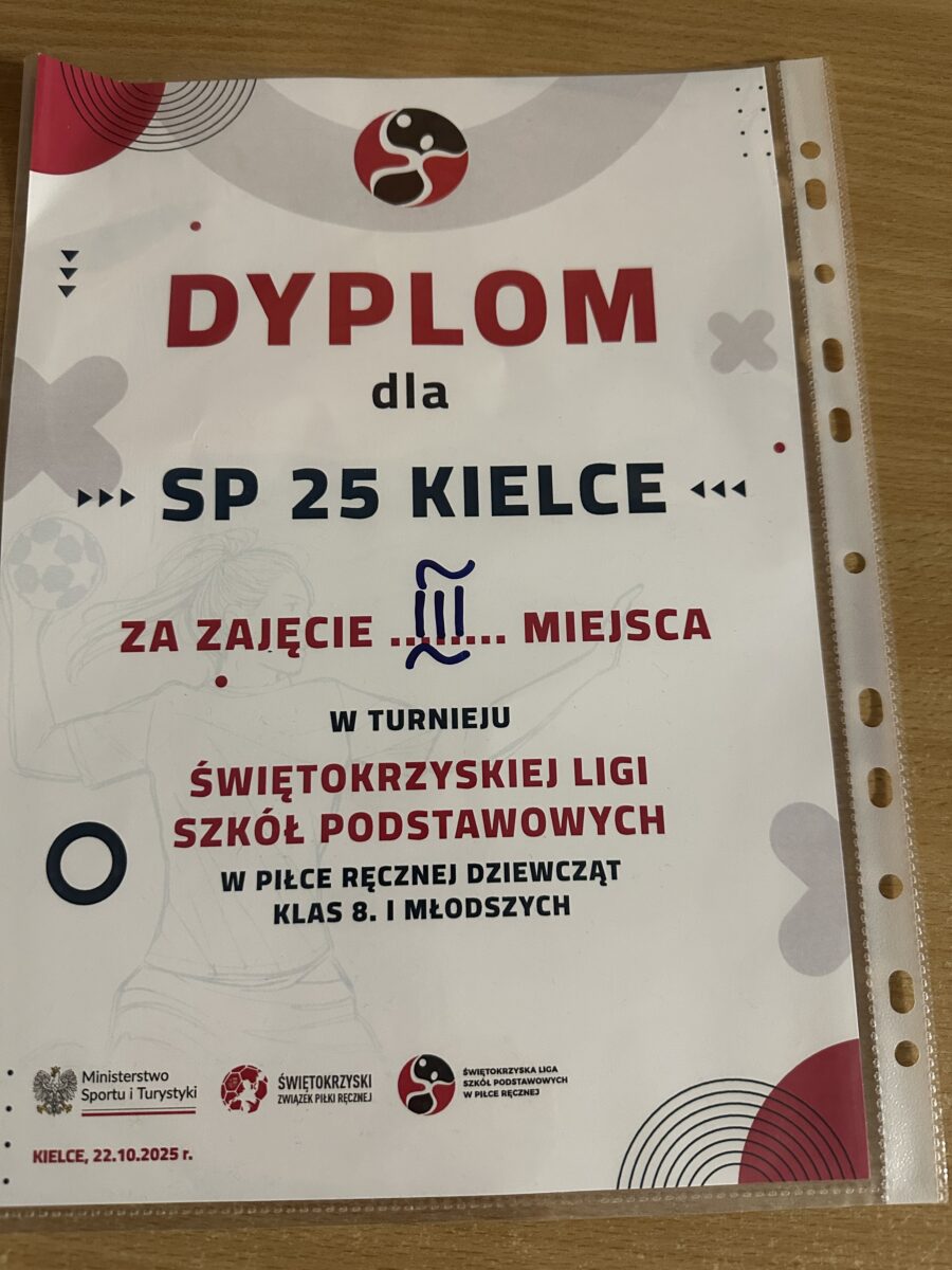 23 października br. w hali sportowej Zespołu Szkół numer 2 przy ul. Jagiellońskiej 90 w Kielcach, odbył się Finał Świętokrzyskiej Ligi SP w piłce ręcznej chłopców klas VI. Reprezentacja naszej szkoły (G. Brzeziński, W. Krochmal, B. Orawiec, O. Pióro, W. Łuczyński, W. Niźnik, M. Nowakowski, M. Radzik, F. Tokar, M. Trzęsień, P, Wicha ) dzielnie walczyła w rozgrywce finałowej, jednak zawodnicy z SP nr 39 w Kielcach okazali się lepsi. Nasi młodzi szczypiorniści pokonali ekipę ZSO MS z Ostrowca Św. oraz drużynę ZPO z Jurkowic. Na podsumowaniu rywalizacji nagrody wręczali: Wiceprezes Związku Piłki Ręcznej R. Wasiak, Prezes Świętokrzyskiego Związku Piłki Ręcznej L. Papaj, Wiceprezes Świętokrzyskiego Związku Piłki Ręcznej T. Olesiński oraz Prezes Klubu Industrii Kielce P. Papaj. Wsparcie i dofinansowanie projektu zawdzięczamy Ministerstwu Sportu i Turystyki, a opiekę medialną nad całym wydarzeniem objęło Radio Kielce. Podopiecznym p. M. Kiniorskiej serdecznie gratulujemy sukcesu!.