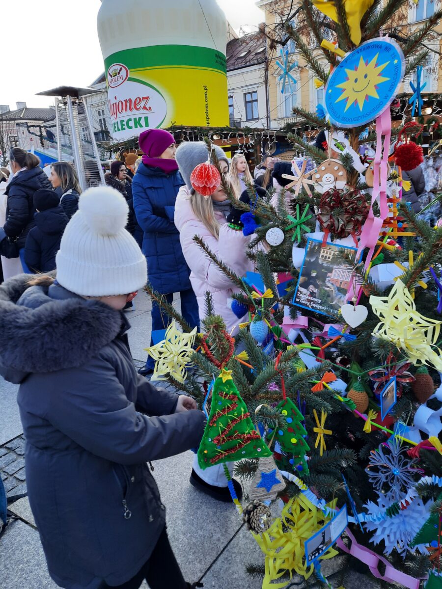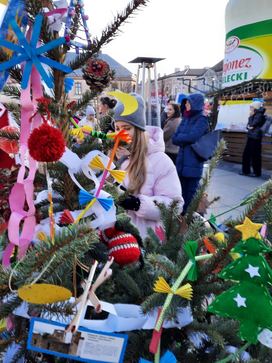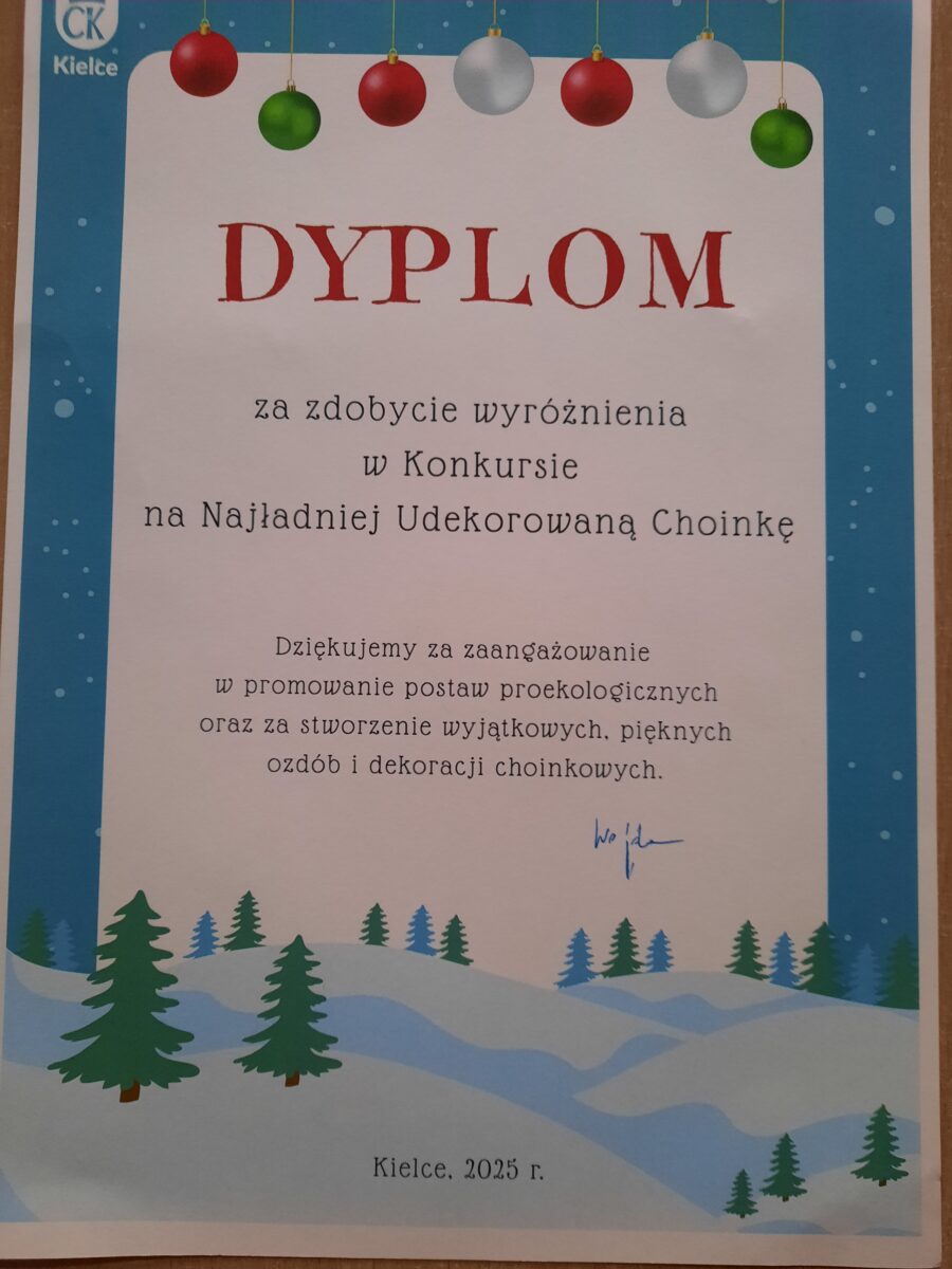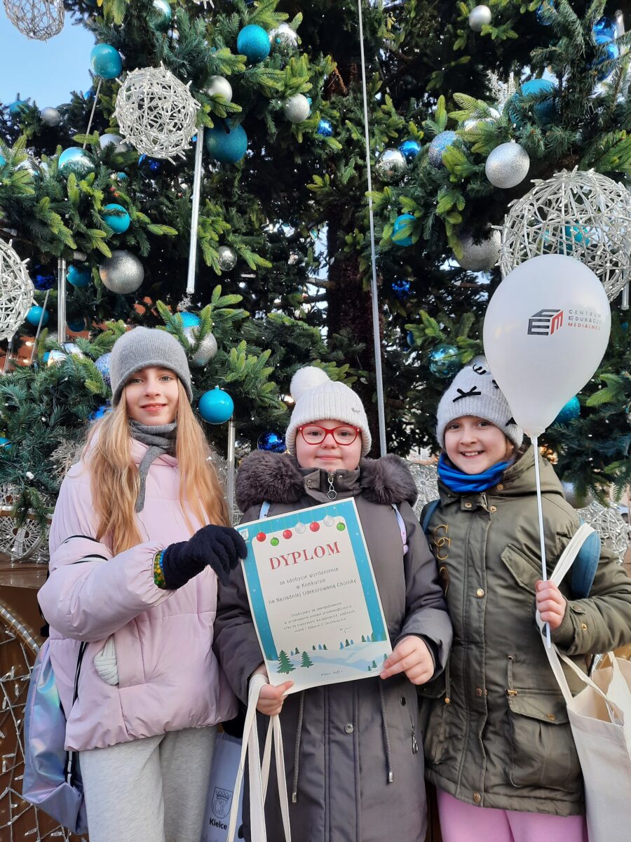 W dniu 13 grudnia w ramach Jarmarku Świętokrzyskiego na Rynku Kieleckim odbył się konkurs dla szkół na najładniej udekorowaną choinkę. Zadaniem uczestników, było ozdobienie choinek dekoracjami wykonanymi z naturalnych materiałów lub przy użyciu tradycyjnych form zdobniczych, nawiązujących do Świąt Bożego Narodzenia. Naszą szkołę reprezentowały trzy dziewczynki z klasy 4a. Ozdoby choinkowe wykonywaliśmy wykorzystując zasoby Szkolnego Laboratorium Przyszłości. W wyniku zmagań konkursowych otrzymaliśmy wyróżnienie.