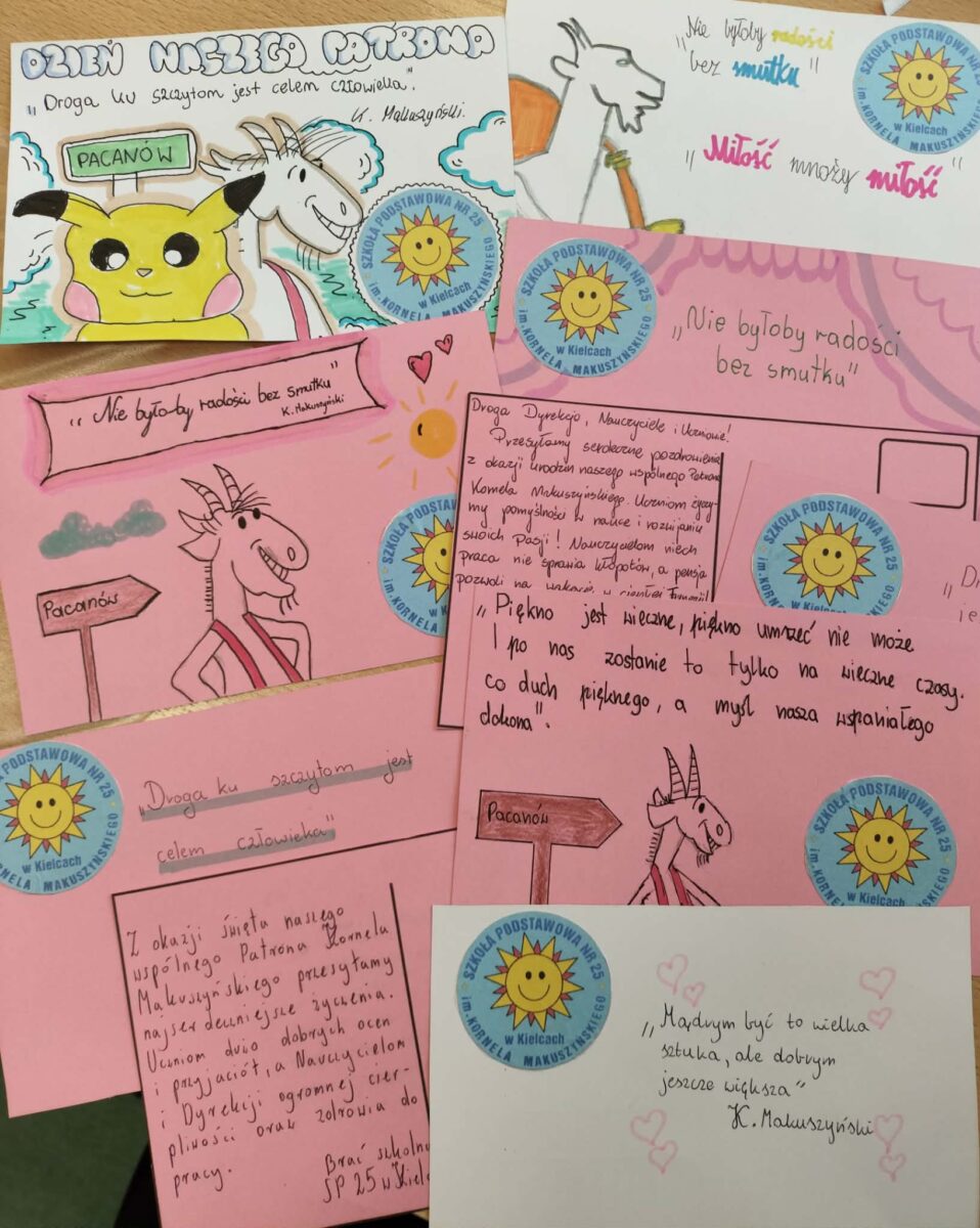 W ramach obchodów urodzin naszego patrona – Kornela Makuszyńskiego, starsi uczniowie wzięli udział w akcji pisania kartek do szkół w całej Polsce, które również noszą imię autora „Szatana z VII klasy”. Wychowankowie SP 25 z klas młodszych wykonali także z tej okazji wspaniałe portrety Mistrza. Mamy nadzieję, że pięknie przyozdobione kartki pełne wspaniałych życzeń i pozdrowień sprawią wiele radości odbiorcom. Niech w cały kraj niosą się słowa naszego wspaniałego opiekuna: „Stracony jest każdy dzień bez uśmiechu”.