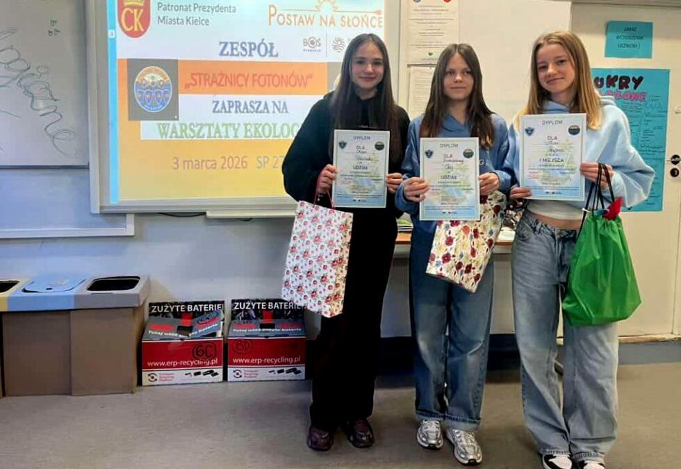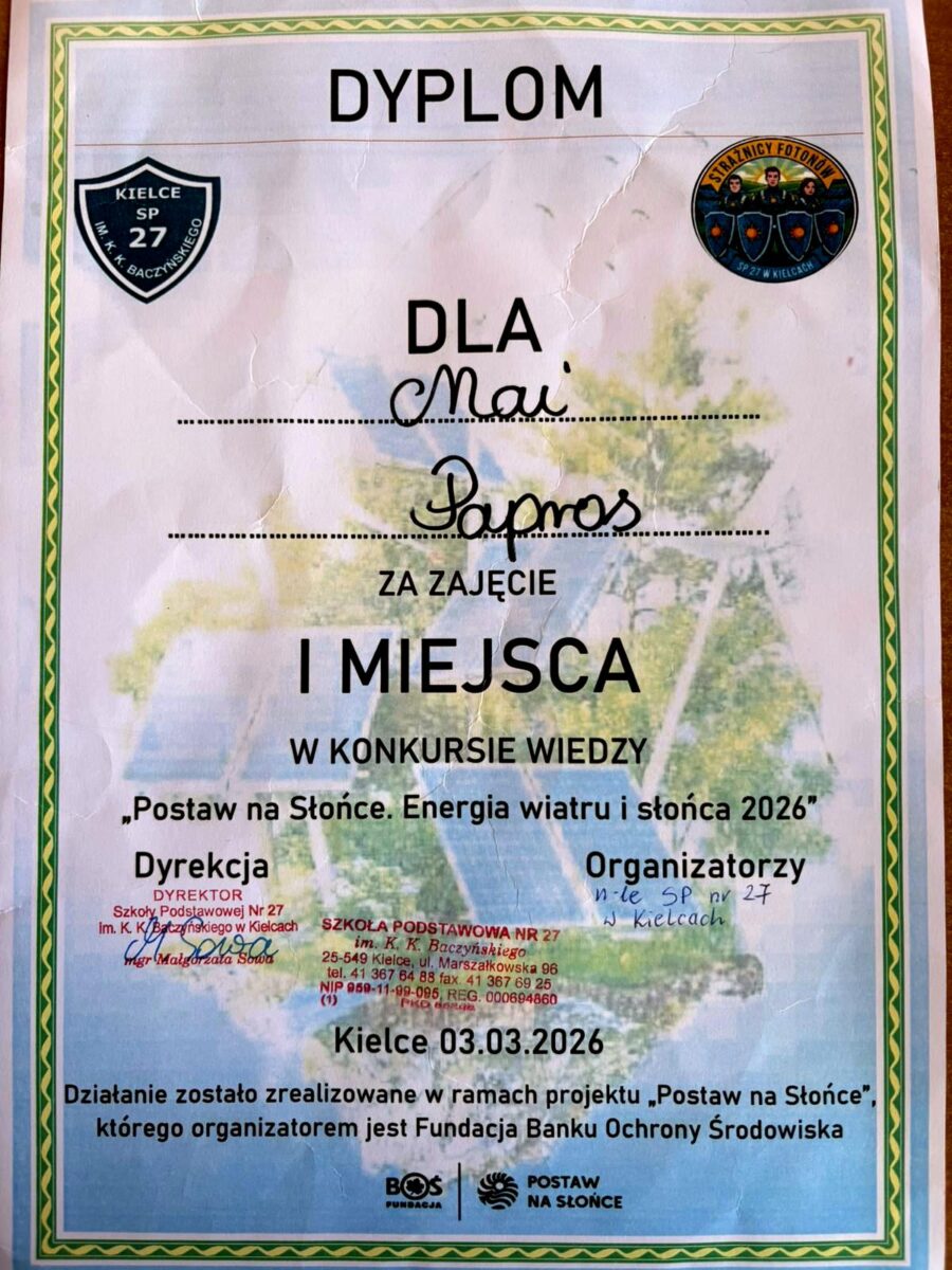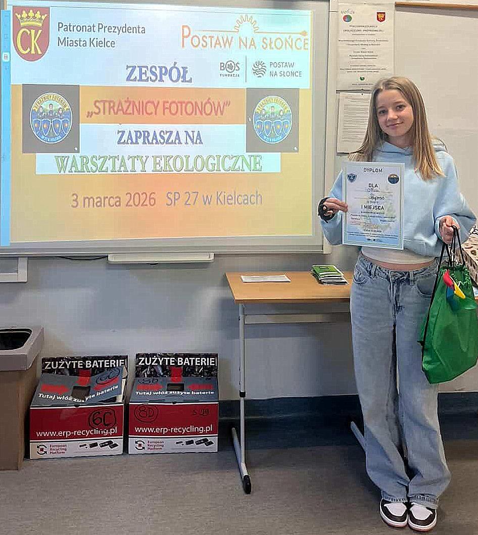 Podczas tegorocznych warsztatów ekologicznych zorganizowanych przez Szkołę Podstawową nr 27 w Kielcach szczególnie wyróżniła się Maja Papros z kl. 7f, zdobywając I miejsce w międzyszkolnym konkursie wiedzy „Postaw na Słońce. Energia wiatru i słońca 2026”. Uczennica wykazała się doskonałą znajomością zagadnień związanych z odnawialnymi źródłami energii.