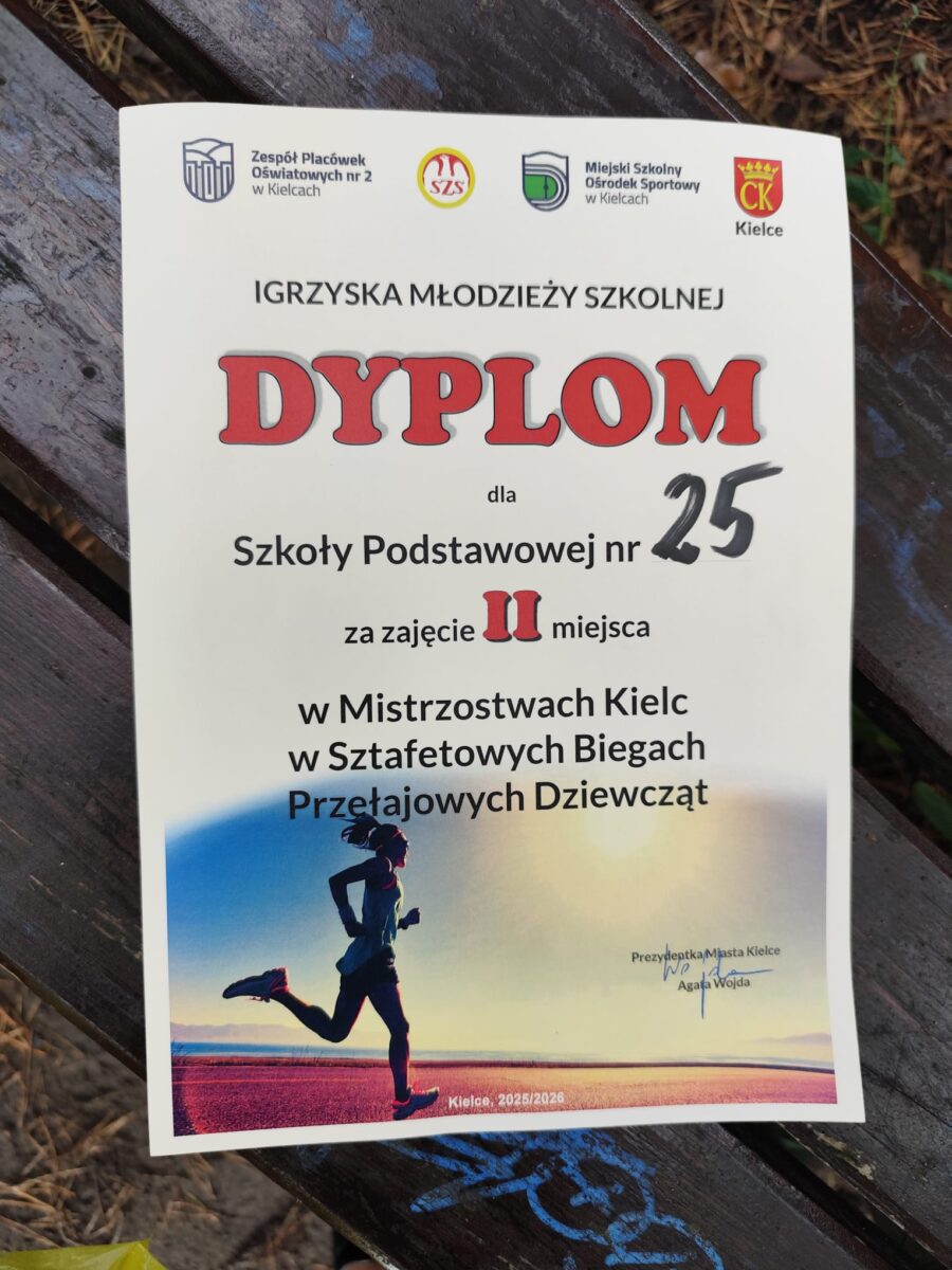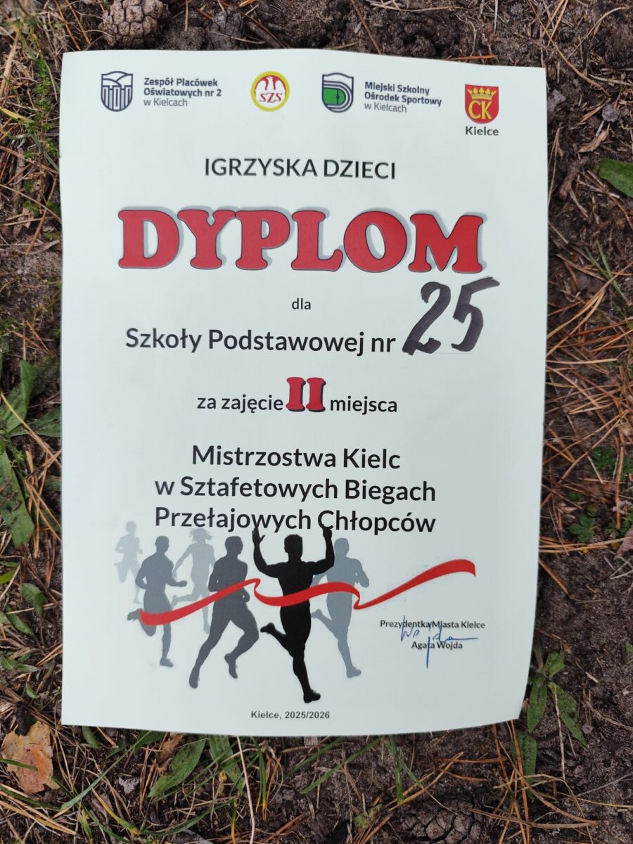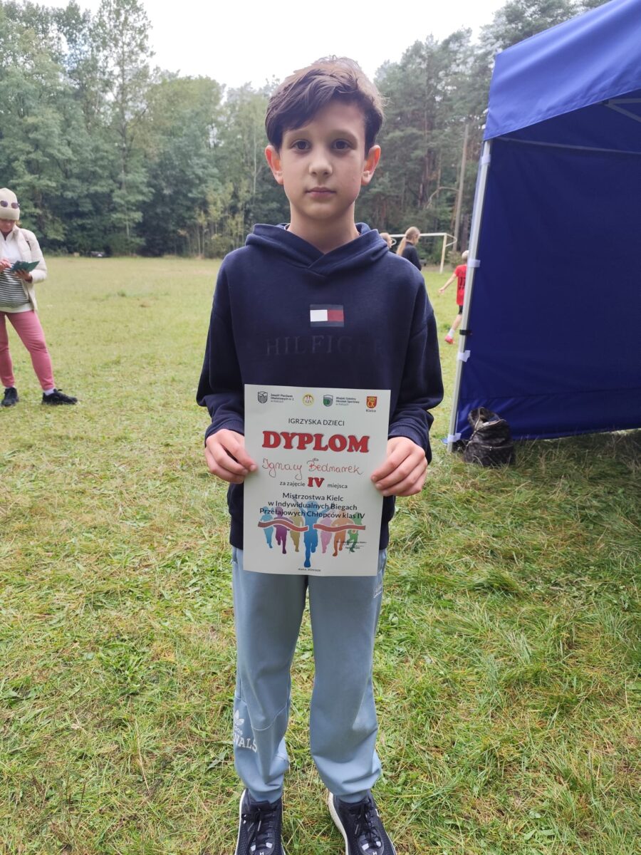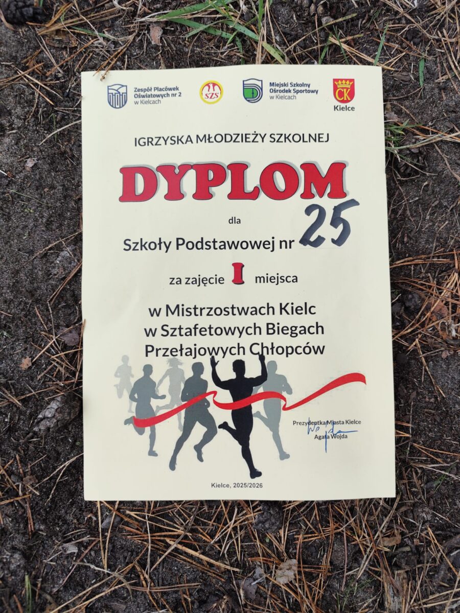 W dniach 6-7 października odbyły się Mistrzostwa Kielc Szkół Podstawowych w sztafetowych i indywidualnych biegach przełajowych. Uczniowie startowali w 3 kategoriach: klasy 4, 5-6 oraz 7-8. Jak co roku na starcie zjawiła się również mocna reprezentacja biegaczy naszej szkoły. Bardzo dobrze zaprezentowały się nasze sztafety: chłopcy najstarszych klas (J. Dudek, P. Mikina, A. Pietraszek, L. Gawlik, D. SIlivanov, N. Szuba, F. Wąchała, J. Szymoniak, T. Czapka, P. Ludwiński, B. Zamojski) okazali się bezkonkurencyjni i stanęli na najwyższym podium, zdobywając I miejsce i tytuł Mistrzów Kielc; ich młodsi koledzy z klas 4-6 (B. Gajos, M. Mazur, M. Nowakowski, M. Ludwinek, F. Pająk, J. Dąbrowski, A. Górecki, T. Mojecki, O. Pióro, M. Latała, W. Łuczyński, A. Kuchta, M. Trzęsień, D. Grudziński) również stanęli na podium „oczko” niżej, zdobywając srebrne medale. Drugiego dnia zawodów swoją siłę i wytrzymałość pokazały dziewczęta z klas 7-8 (I. Wijas, E. Gąsior, Z. Cygan, L. Goraj, L. Ścibór, L. Dzikowska, J. Wasik, N. Lewczuk, H. Rabiej, J. Książek, A. Grzegorczyk, H. Grzegorczyk), zajmując 2 miejsce i zdobywając tytuł wicemistrzyń Kielc. W indywidualnej rywalizacji Ignacy Bednarek z klasy czwartej uplasował się ostatecznie zaraz za odium, na IV miejscu. Wszystkim naszym reprezentantom serdecznie gratulujemy pierwszych sukcesów w zawodach lekkoatletycznym w nowym roku szkolnym!.