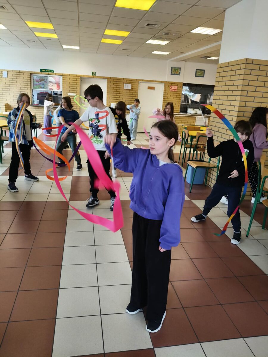 Po zakończonej pracy dzieci zostały zaproszone na słodki poczęstunek i wspólne zabawy z wykorzystaniem szarf tanecznych.