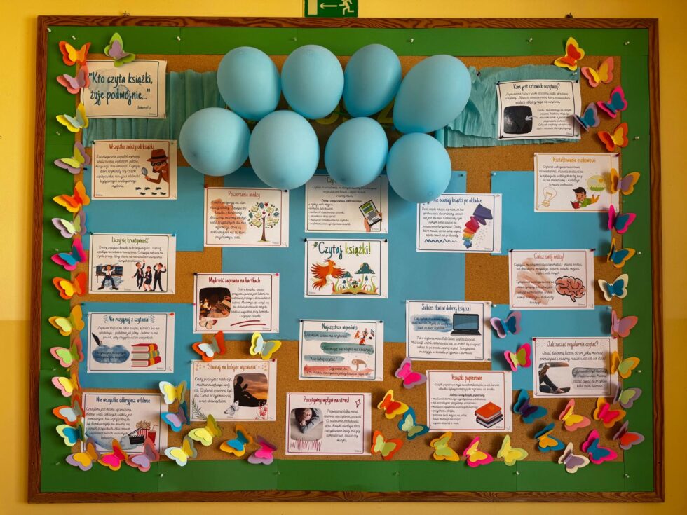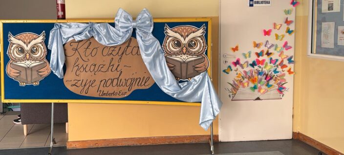 Przestrzeń przy bibliotece i czytelni zyskała wyjątkową, artystyczną oprawę. Tematyczna dekoracja nie tylko przyciągała wzrok, ale przede wszystkim stanowiła zaproszenie do fascynującej podróży w głąb świata wyobraźni. Nauczyciele pracujący w bibliotece z ogromnym entuzjazmem i w wyjątkowy sposób zachęcali tego dnia każdego ucznia do odwiedzin oraz wypożyczenia interesujących lektur, pomagając odnaleźć książki, które mogą stać się początkiem nowej przygody.