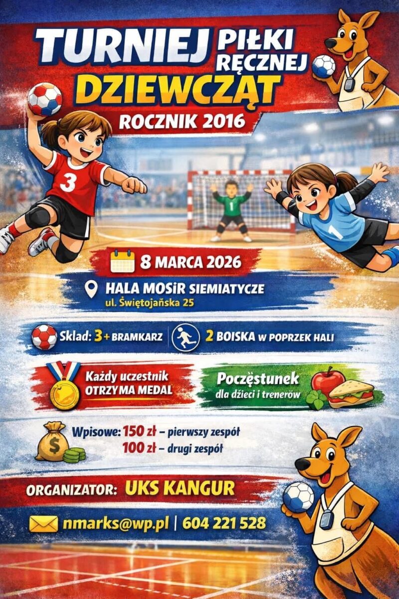 8 marca w hali MOSiR w Siemiatyczach, odbył się Turniej mini piłki ręcznej dziewcząt, którego organizatorem był UKS Kangur Siemiatycze. W wydarzeniu wzięło udział 8 drużyn, a na parkiecie zaprezentowało się około 70 młodych zawodniczek. Turniej miał przede wszystkim charakter szkoleniowy, każda zawodniczka dostała pamiątkowy medal i wszystkie zespoły stanęły na najwyższym podium!. Najważniejsza była dobra zabawa, pierwsze sportowe doświadczenia oraz radość ze wspólnej gry. Dziewczynki poprzez grę w piłkę ręczną mogły rozwijać swoje umiejętności, ale przede wszystkim świetnie się bawić i czerpać radość ze sportu, Naszą szkołę reprezentowały uczennice klas II i III: Oliwia Błaszczyk, Oliwia Łyczek, .Hania Wójcik, Marcelina Parkita, .Julia Orawiec, .Lena Cieśla, Antosia Rojewska, Klara Rojewska, Zosia Dudek, Emilia Krzysiek, Agata Korus, Ola Biernat, Ola Kulińska. młode szczypiornistki zostawiły serce na pakiecie i bardzo dobrze zaprezentowały się na Ogólnopolskim Turnieju pod okiem trenerki I. Kozioł.